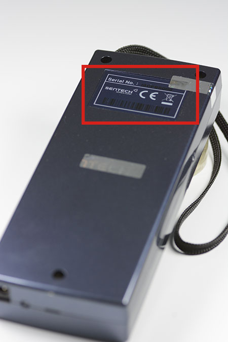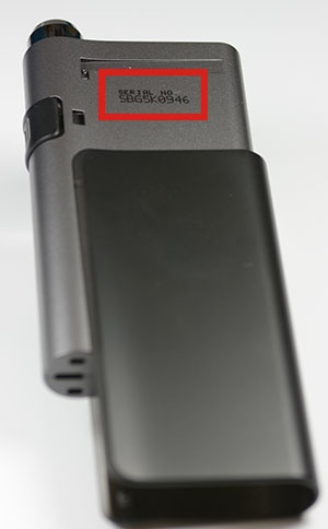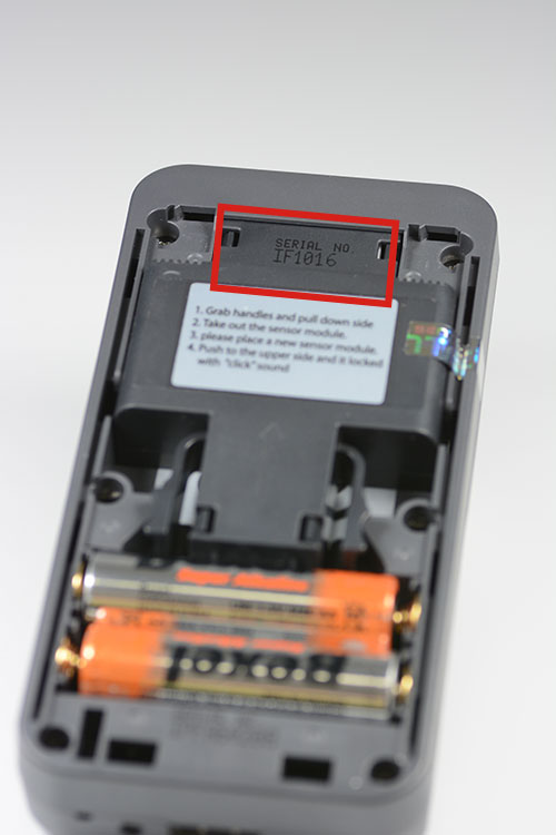 Sériové číslo najdete na několika místech: na Alkohol testeru, pod krytem baterie, pod baterií, ukázkové foto: